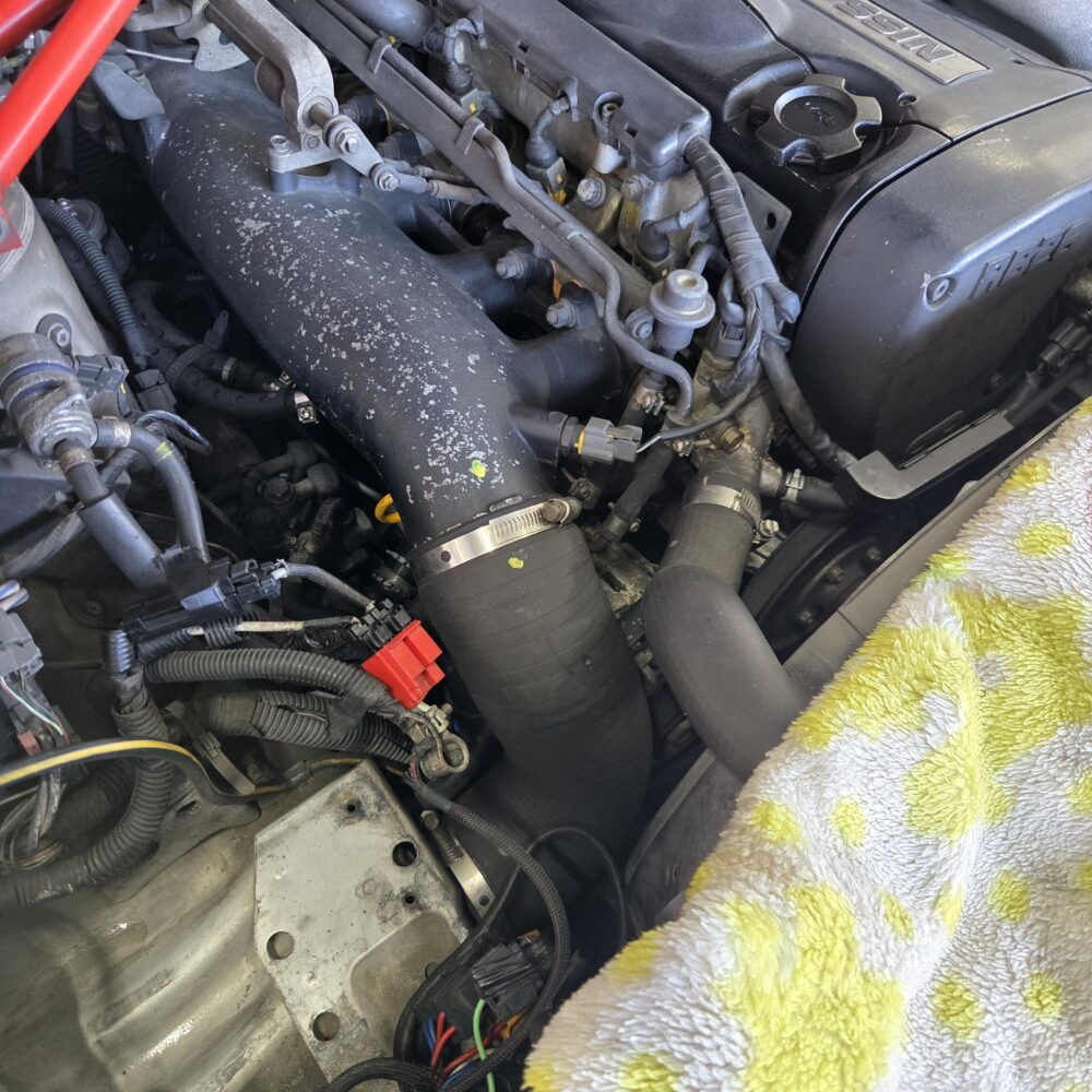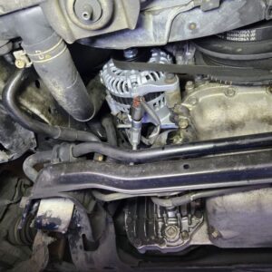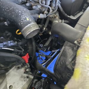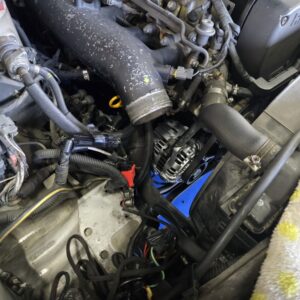 取り外しにかかります。エンジン向かって左下に潜んでいますのでインタークーラーのパイプなどを外してスペースを作ります。